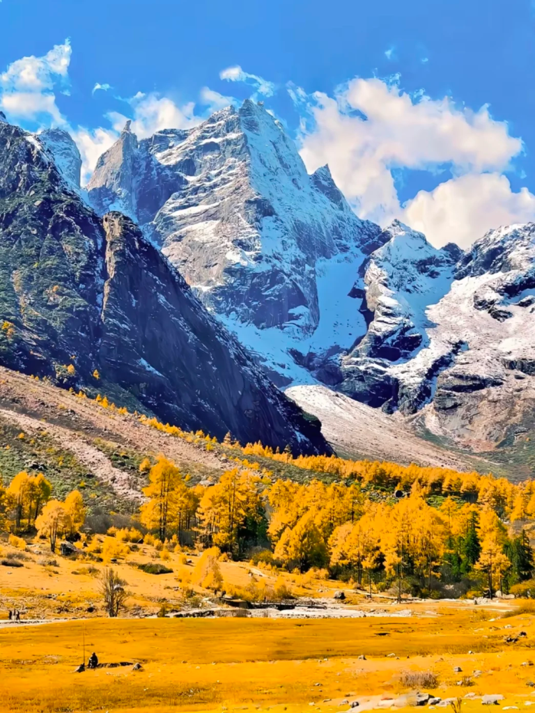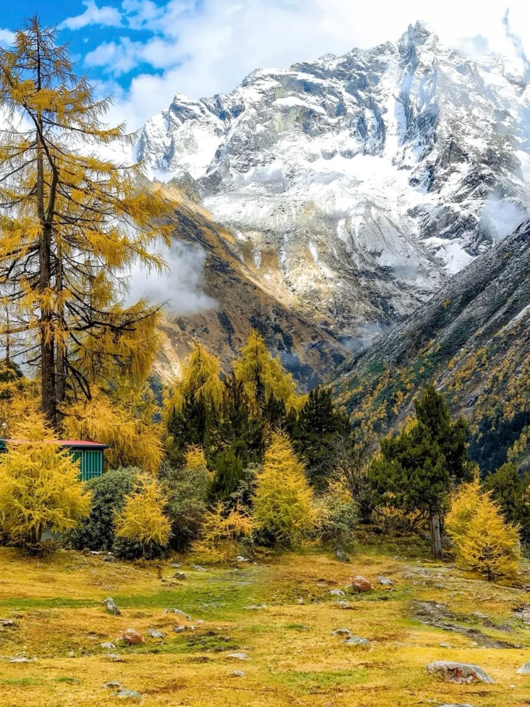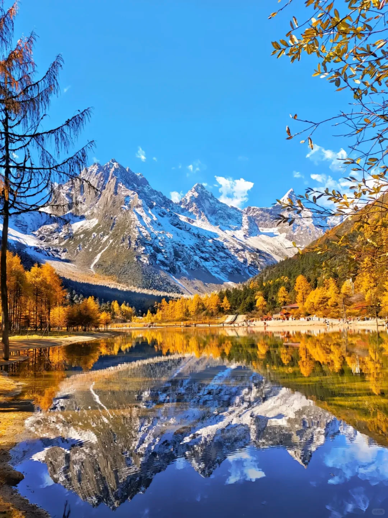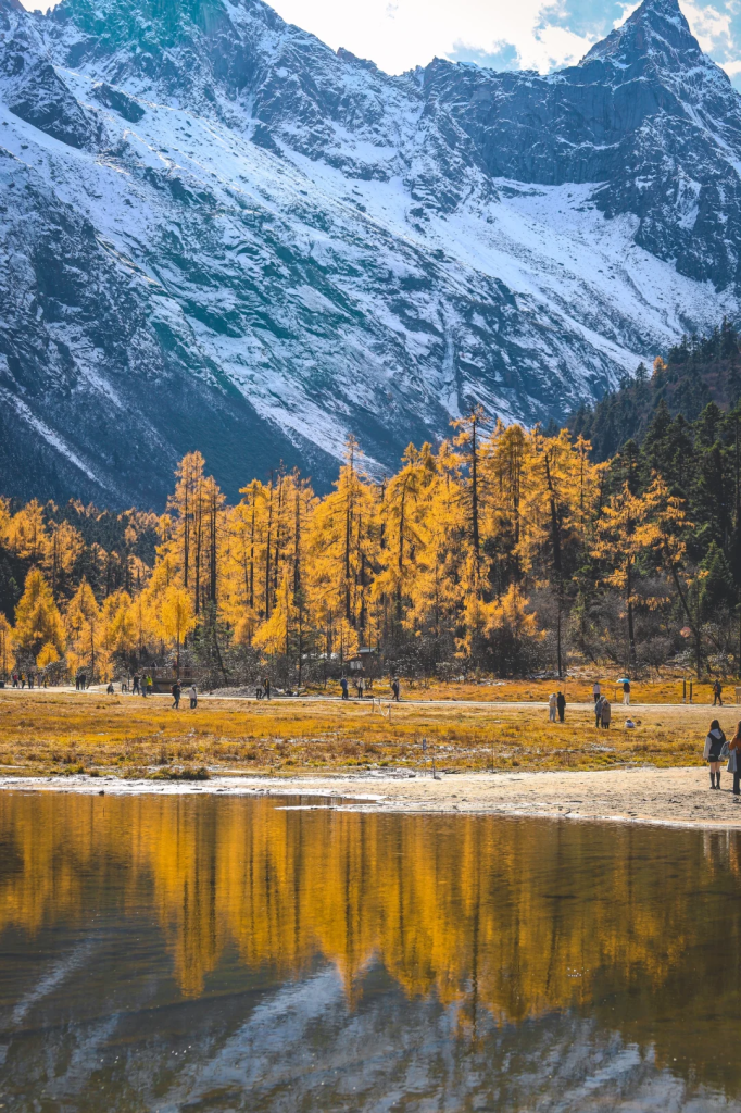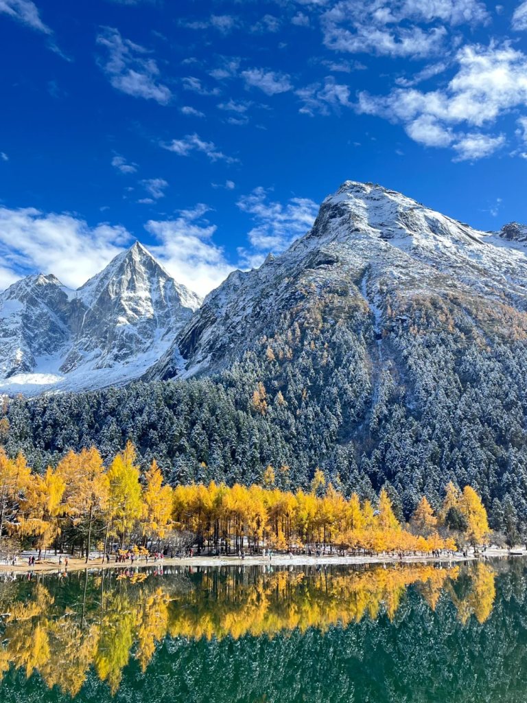 每年10月中下旬至11月,這座四姑娘山背後的秘境,就會上演一場極致的色彩盛宴——金黃的白楊、火紅的楓葉、墨綠的冷杉,與碧藍的海子、潔白的雪峰交織,每一幀都像精心繪制的油畫。