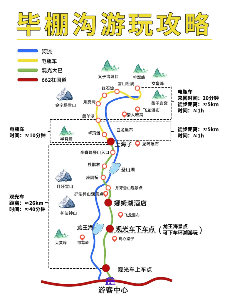 遊玩路線:遊客中心→觀光車至龍王海(徒步棧道)→電瓶車至磐羊湖(環湖徒步)→電瓶車至燕子岩窩(徒步卓瑪灘)→返程。