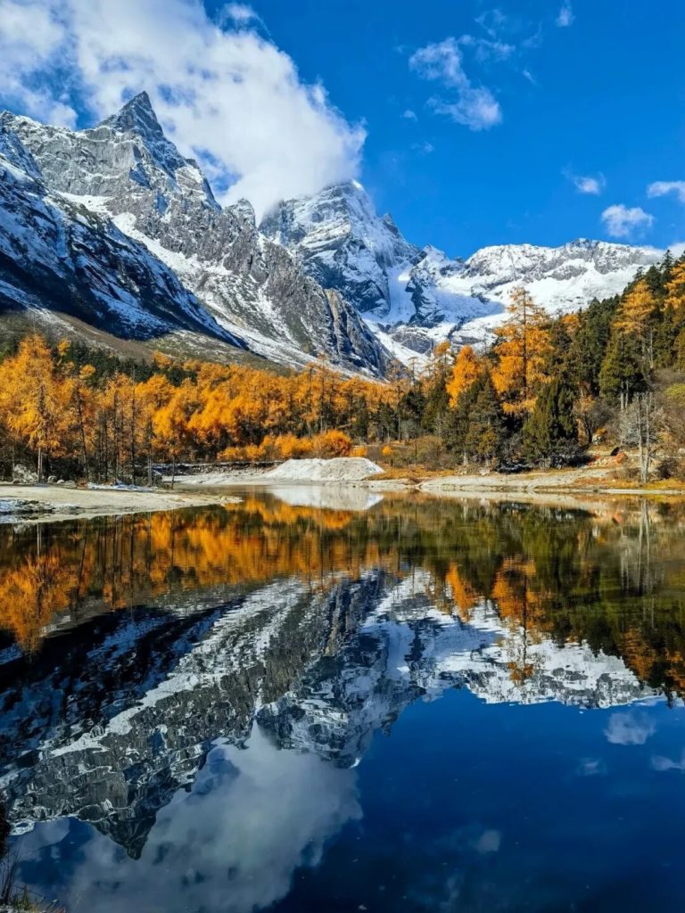每年10月中下旬至11月,這座四姑娘山背後的秘境,就會上演一場極致的色彩盛宴——金黃的白楊、火紅的楓葉、墨綠的冷杉,與碧藍的海子、潔白的雪峰交織,每一幀都像精心繪制的油畫。
