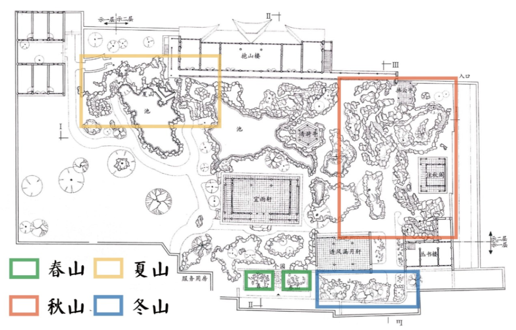 冬山在園東南小庭院中,以蠟梅點題,倚牆放置潔白圓渾的安徽宣石,其中有白色石英結晶熠熠閃光,營造了冬日石上積雪猶存的景象。更為巧妙的是,在冬山南牆上開鑿了四排二十四孔風音洞,借助外面狹巷高牆的氣流變化,產生風吹過呼呼作響的效果,仿若嚴冬北風呼嘯,更添冬之意境。加上小院內冰裂紋鋪地、蠟梅襯托,盡得歲寒冷趣。