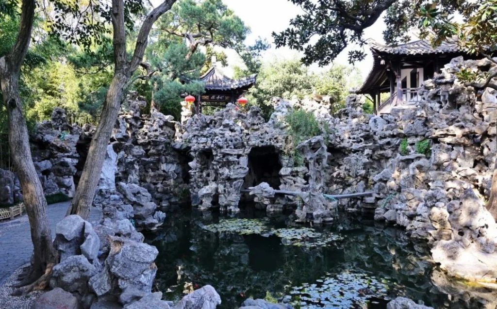 進入口西行,過建築宜兩軒,得見一汪碧潭,後倚一氣勢雄渾的太湖石大假山。山中有洞,中空外奇,配之小潭清碧,取意夏雲多奇峰。假山湖石皴皺,頂部堆疊如雲層環繞,仿若夏雨欲來。山下池水流入洞穀,渡過曲橋,有洞如屋,曲折幽邃,洞口上山石外挑,而水複流入洞中,景深豐富,在夏日更覺涼爽。