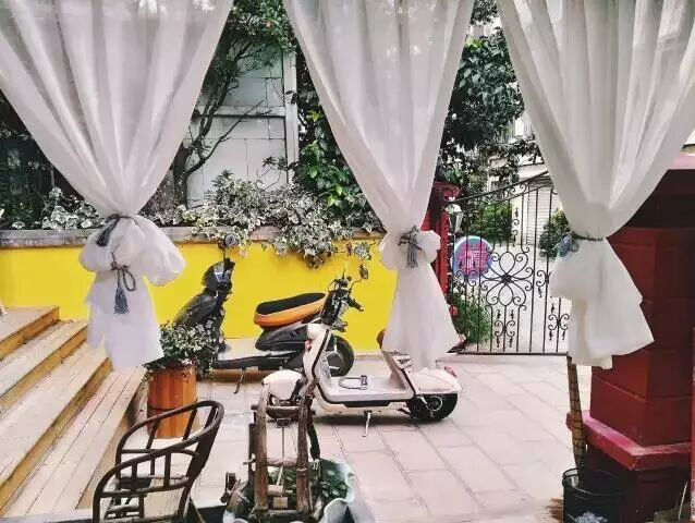 走近才發覺,低調白牆內裏是何等的濃墨重彩:綠植從明黃牆壁垂下,白色紗幔,大紅牆柱,頗有幾分廈門的文藝味道。