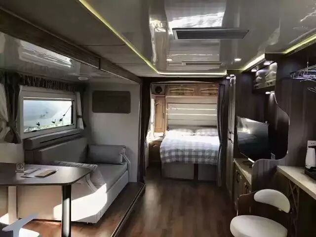房車裝飾溫馨、奢華,書櫃、吧台、酒櫃、自動麻將機、冰箱、沙發等一應俱全,具有裝修精美、設施完善、體驗獨特、服務周到等特點,將讓體驗者感受到家庭的溫馨及便利。