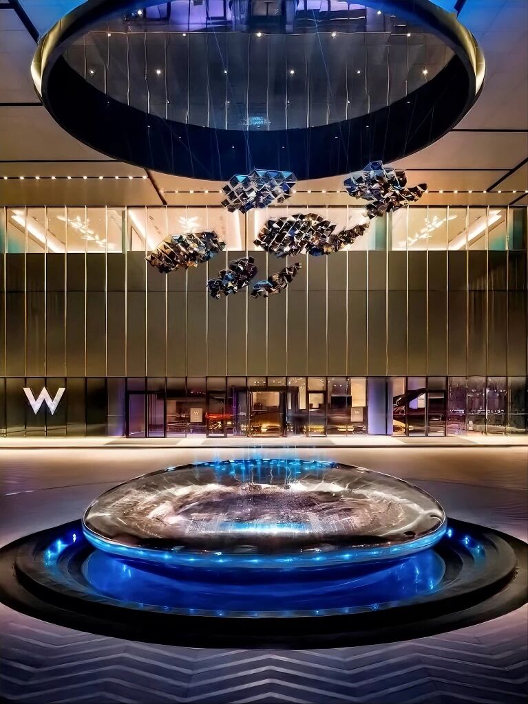 步入大堂,立刻被高達15米左右的挑高震撼,整面落地窗帶來采光的同時,還將湖水引入室內,度假感十足,將城市中的緊繃感一掃而光。