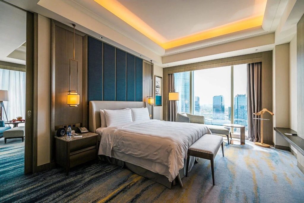 71平米的豪華客房坐擁金雞湖及城市全景,擁有步入式衣帽間,幹濕分離的浴室,以及超大浴缸。尤其是這面270°玻璃幕牆,可俯瞰蕩漾水色或眺望城市天際線,十分愜意。