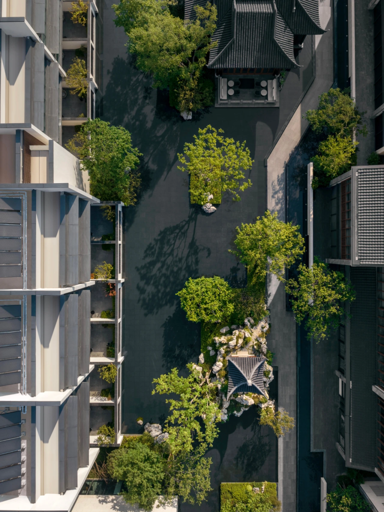 酒店的地理位置可謂鬧中取靜。毗鄰姑蘇區新開的商場中海竹輝環宇薈,從熱鬧的商業區穿梭進去,在一片竹林前,蘇州金普頓竹輝酒店便到了。
