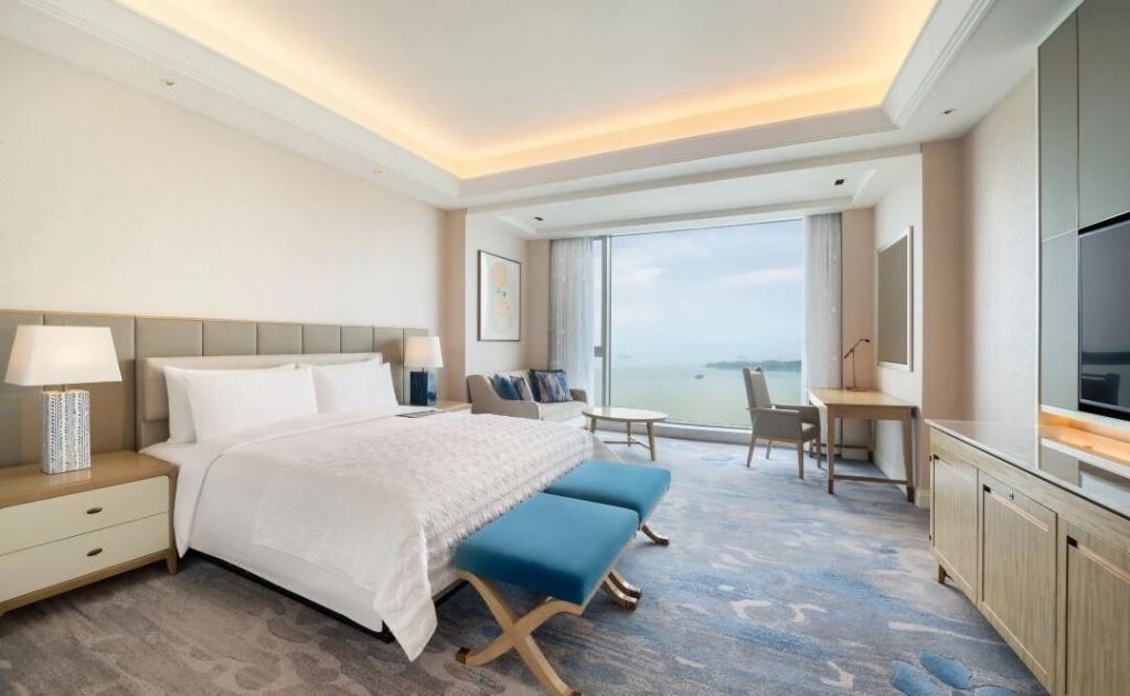 酒店458間客房及套房,面積48㎡起,間間配浴缸和超大畫幅的落地玻璃設計,讓戶外風光一覽無餘,非常開闊。