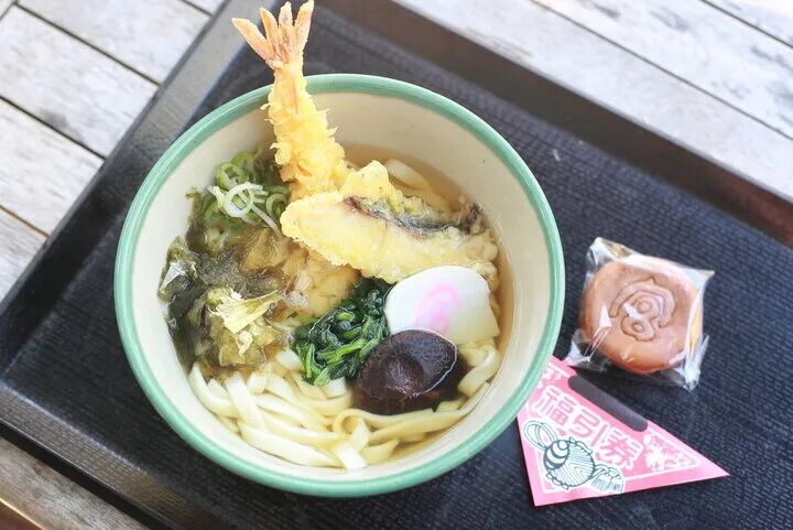 店裏有各種不同口味的寬面,但神宮店獨有的限定菜單是‘大吉面’。這是一份豪華寬面,使用了鯛魚天婦羅、幹昆布等吉祥寓意的食材。另外還附帶抽簽活動,如果中了,就可以得到一份‘宮饅頭’。