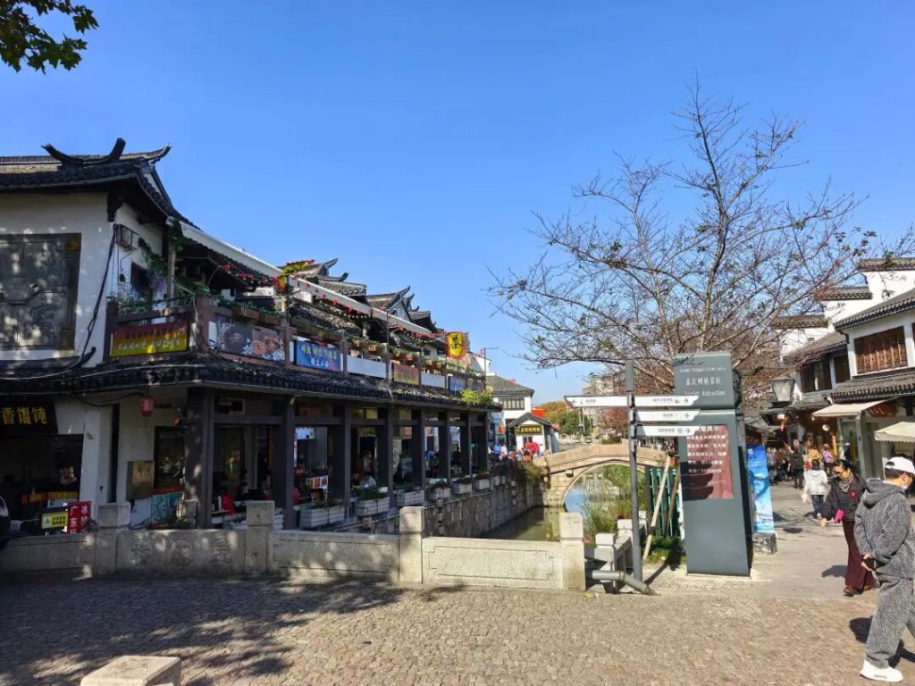 老街建築以清末民初"前街後河"的風格為主,多為磚木結構的廳堂式平房和二層樓房,青瓦屋頂,觀音兜和馬頭牆,配以彈格石路,具有濃鬱的江南水鄉民居特色。吃飽了便在暖暖的陽光中走到秋霞圃的南門處。