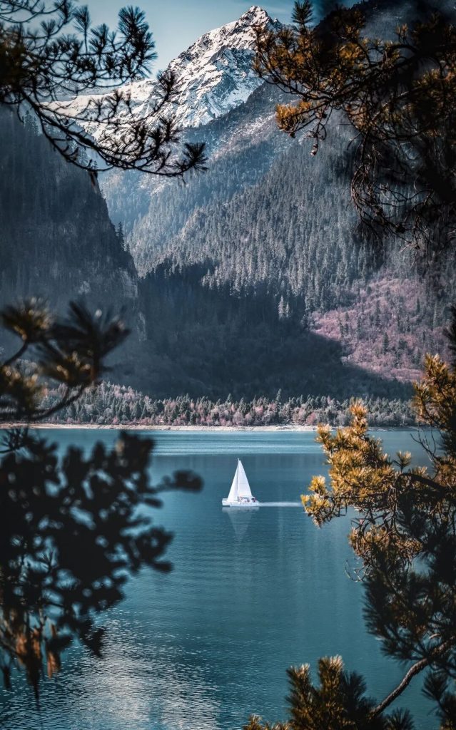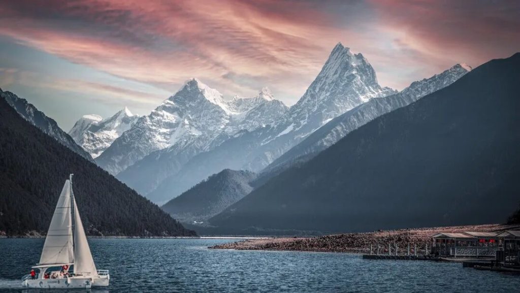 在這裏,湖水從雪山奔湧而來,經過一片綠意盎然的草甸,彙入湖心島背後的幽深峽穀。遺忘碼頭因此得名,寓意著人們可以將煩惱和憂愁遺忘在這片美麗的湖光山色中。