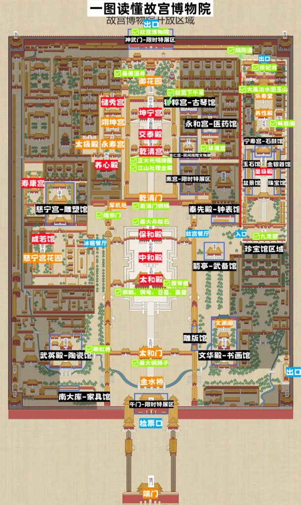 午門→太和門→太和殿→中和殿→保和殿→景仁宮→延禧宮→承乾宮→交泰殿→坤寧宮→乾清宮→永壽宮→翊坤宮→儲秀宮→禦花園→神武門。