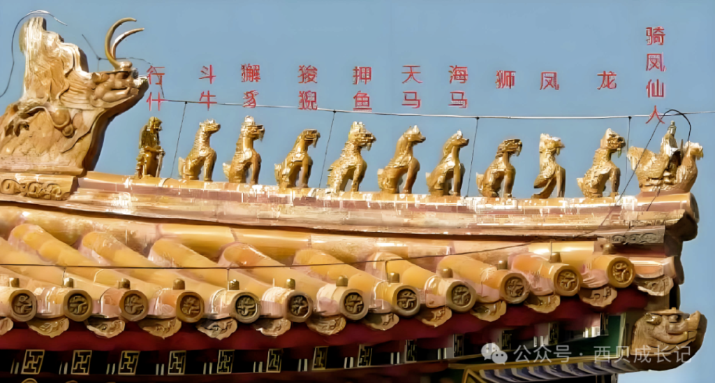 太和殿作為故宮裏等級最高的宮殿,其屋頂脊獸的數量和種類都彰顯了皇家的至高無上地位。這些脊獸分布在房屋兩端的垂脊上,由下至上的順序依次是:龍、鳳、獅子、海馬、天馬、狎魚(也稱押魚)、狻猊、獬豸、鬥牛、行什。