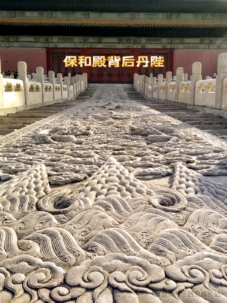 保和殿最吸引人的地方,是背後的丹陛石,長 16.57 米,寬 3.07 米,厚 1.70 米,重量超過 200 噸。在這塊巨大的禦路石上,雕刻著 9 條淩空飛舞的巨龍,它們或升或降,高高地突起在巨石的表面,造型十分生動。巨龍身下是萬朵雲霞。石雕的下部有 5 座寶山,寶山之川是流暢的水紋。