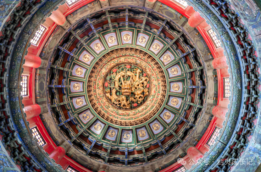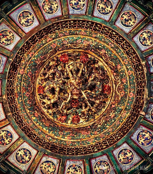 千秋亭的藻井設計精巧,采用了金絲楠木進行雕刻,彩繪顏色至今依然保存完好。陽光透過藻井下的窗戶灑入亭內,營造出一種夢幻般的光影效果,特別是在大雪節氣前後的下午3點左右,據說會有一束光剛好落在龍頭上,如夢似幻,令人歎為觀止。