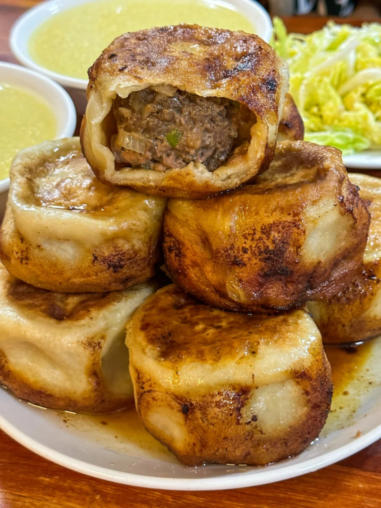 寶瑞門釘肉餅店的肉餅跟拳頭差不多大,7元一個,牛肉大蔥的肉餡特別香,超多鮮濃的湯汁,餅皮比較薄,底部是煎得酥酥脆脆的口感。