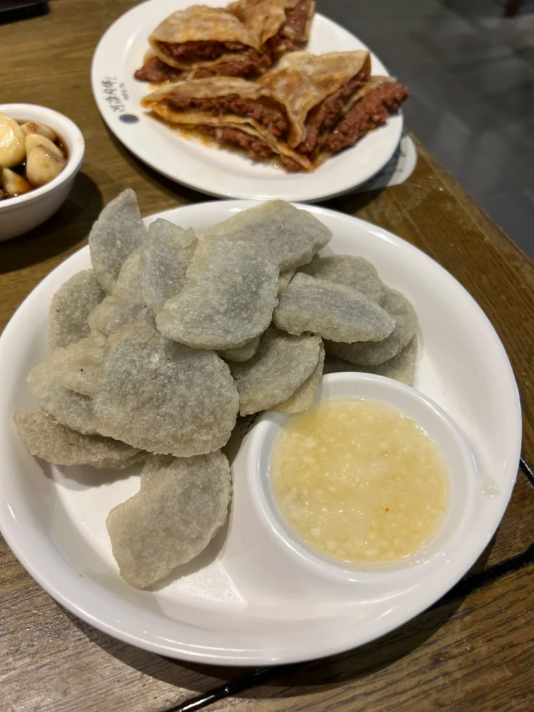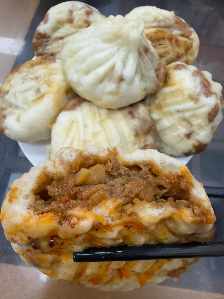 牛肉包子,很大一個,肉餡超級紮實,面皮很薄很松軟,吃起來一點不膩,配上臘八蒜吃真的是絕了。