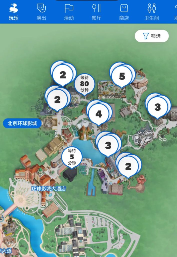 遊玩過程中,官方app和小程序的“地圖”板塊都能查看你所在的位置,了解項目的排隊時間、演出的時間安排等。