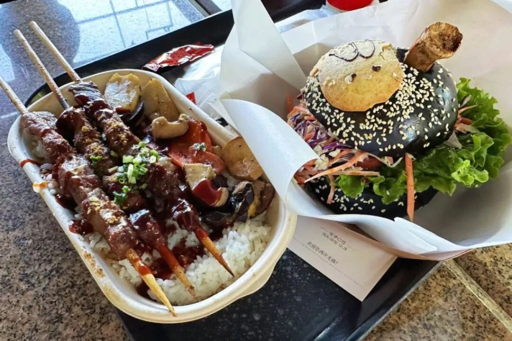 雖然我們1.5天把北京環球影城的項目刷了個遍,但美食只嘗了幾種,我們套餐裏包含的正餐用在了隨機選擇的至景餐廳,官方app裏能提前看到餐廳的招牌菜肴,我們選的是慢烤肋排黑金漢堡和烤牛肉串配米飯,味道都不錯。