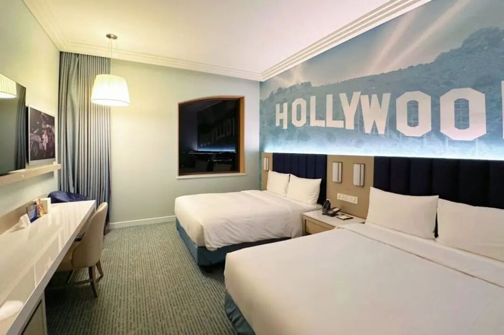 環球影城大酒店的基礎房型豪華雙大床房裝修非常簡約,要不是牆上“HOLLYWOOD幾個大字”,根本就無法體會到你身處環球影城。好在樂園類的酒店床非常大,兩張1.5米的雙人床足夠睡下我們一家四口。更加分的是酒店容許叫外賣,且附近的外賣選擇也挺豐富的。