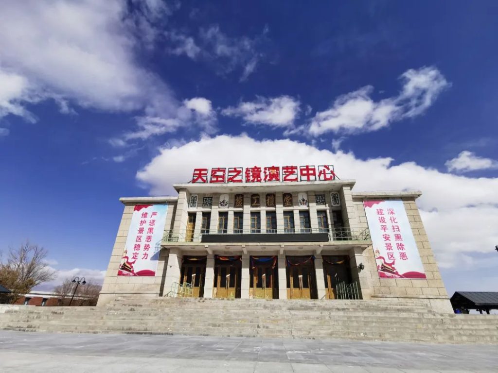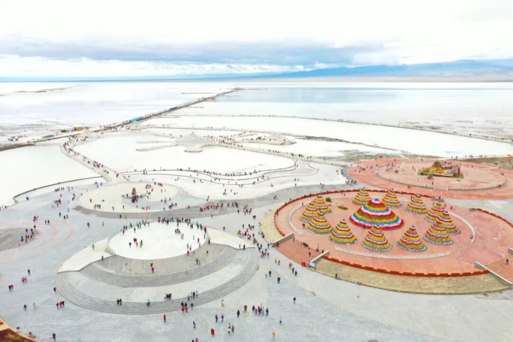 從老禮堂廣場可通過乘坐小火車、電瓶觀光車、步行等方式到達天空之鏡廣場。這裏是核心遊覽區,設置有鹽雕藝術群、鹵水體驗區、觀光平台、經幡廣場、祭湖敖包、美食街區等。