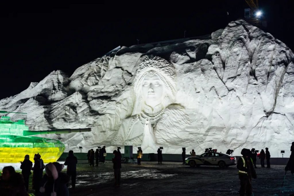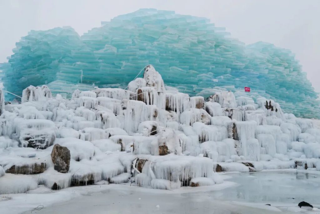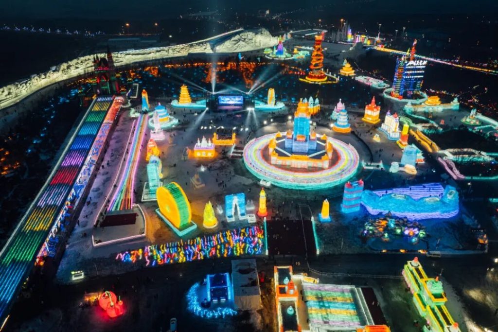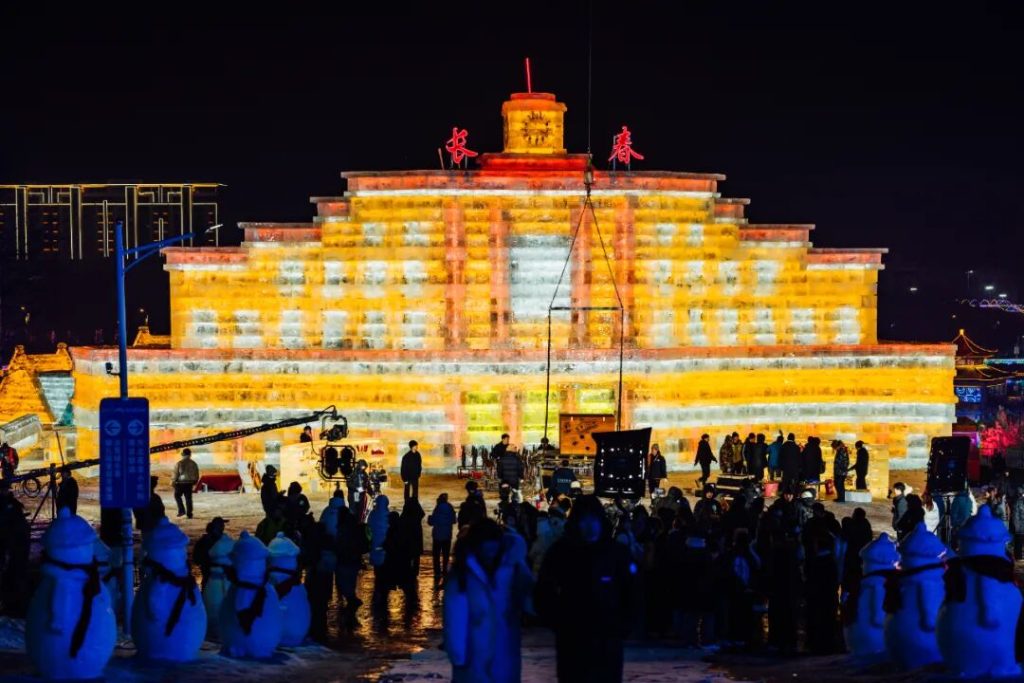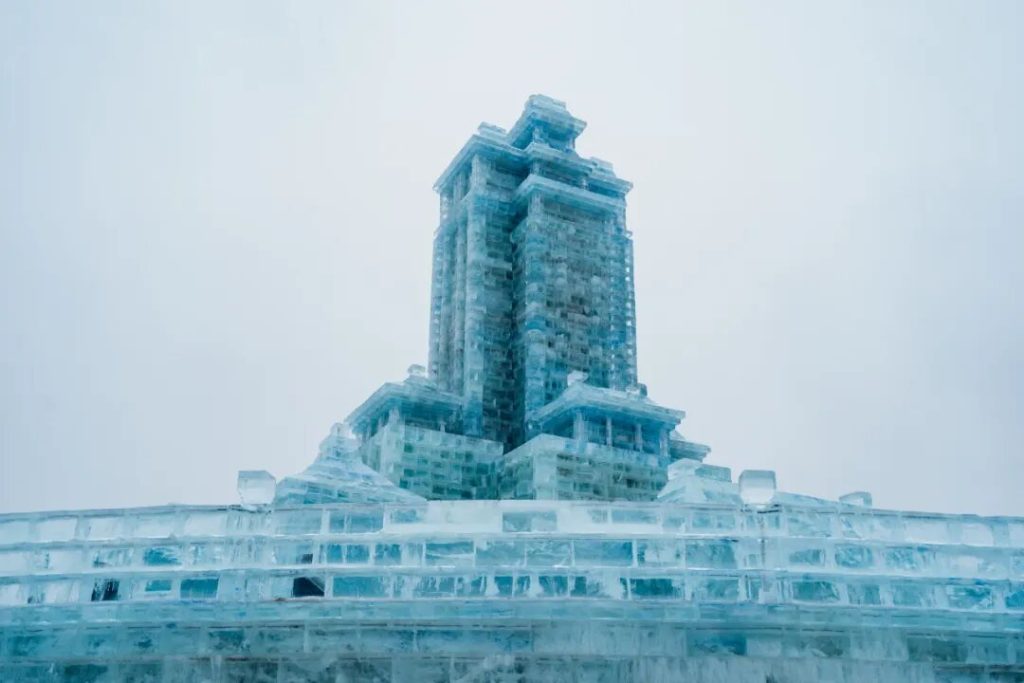 被眾多冰雕圍住的正是今年的主塔——福耀中華,巍峨矗立在整個園區中心,由冰磚層層疊疊向上延伸。