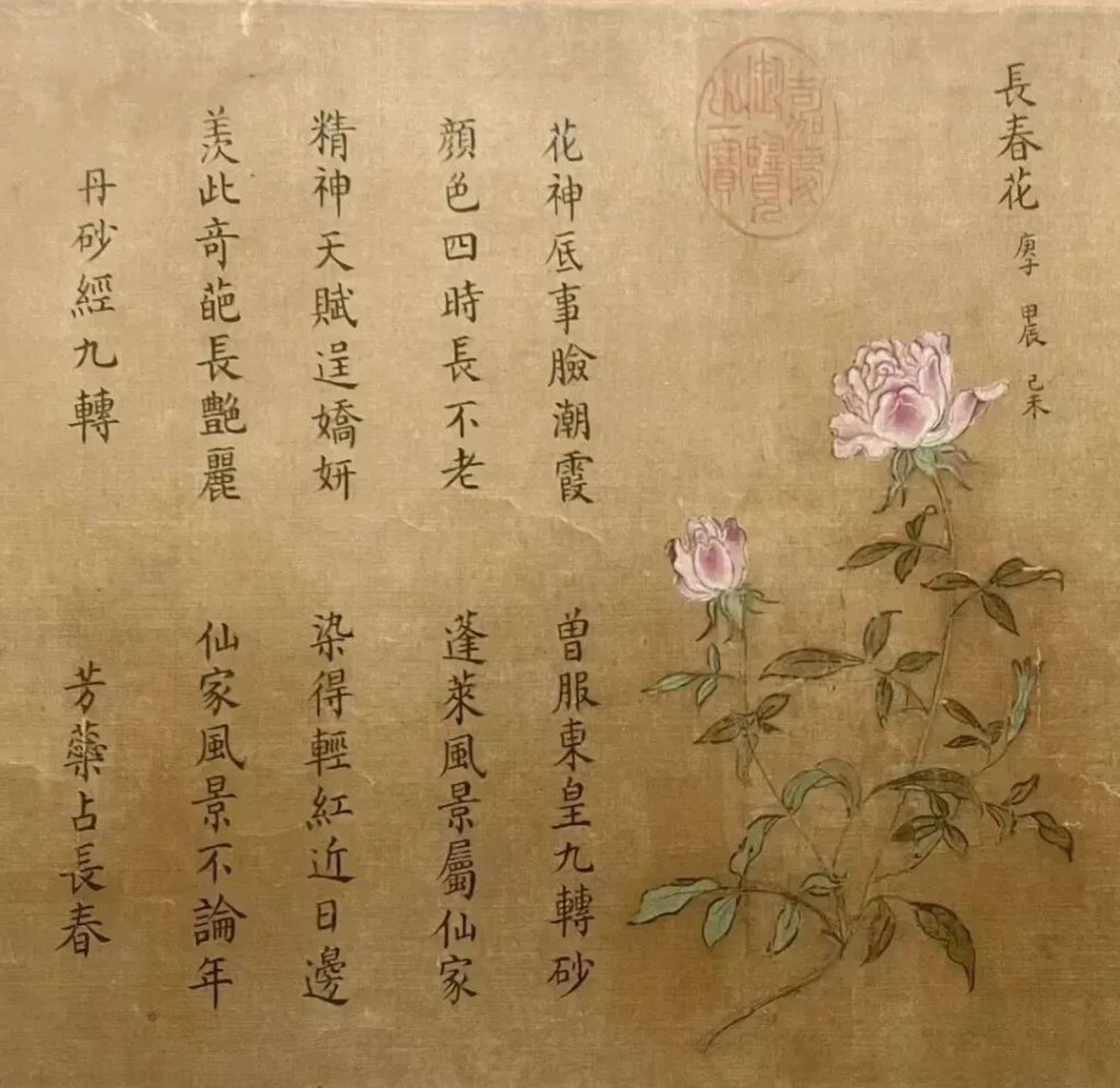 南宋楊婕妤《百花圖》卷,是中國現存最早的一件女性畫家作品,使用礦物色顏料繪制,曆經七百多年依舊色彩濃麗的。全卷橫長3米多,共17段畫面,前11段繪制了壽春花、長春花、荷花、西施蓮、蕙蘭等不同的花卉,剩下的6段則繪制著三星在天、旭日初升、福山壽海等吉祥的意象,每幅畫面還有專屬文案。