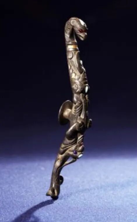帶鉤是一種古老的束衣扣具,此件帶鉤是漢中央王朝賜予夫餘國貴族的,得名於“丙午神鉤,君必高遷”八字錯金銘文,鉤首為一龍頭,鉤體上鑄一鳥喙神人,雙手抱魚於懷中,眼為藍寶石,額鑲綠松石,是一件十分罕見的珍貴工藝品。