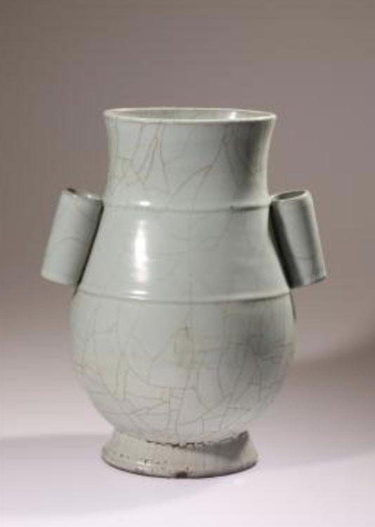 北宋時期的瓷器文物,高22.8厘米,口徑8.3厘米,足徑9.6厘米,貫耳瓶釉色厚潤,端莊典雅,官窯特征明顯,保存完好,是宋代瓷器中的珍品。