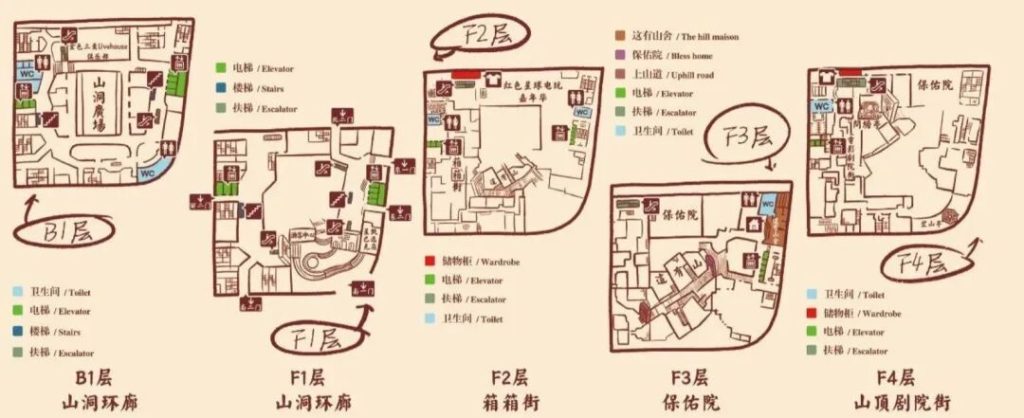 這有山的設計邏輯是把屬於傳統街市的體驗移植進來,並使平面意義上的街市立體化,由單一動線串聯了所有品牌店鋪及建築景觀,這樣客流能夠到達每一個品牌店鋪。
