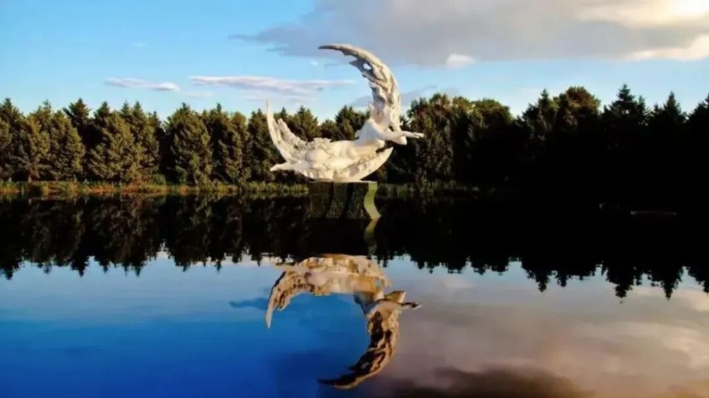 正門廣場中心的噴泉與淨月女神雕塑相映成趣,雕塑將女子與月球的融合,展現了美麗、聖潔、向上、大愛的生命主題,是雕塑大師葉毓山先生耗時兩年創作的藝術精品。
