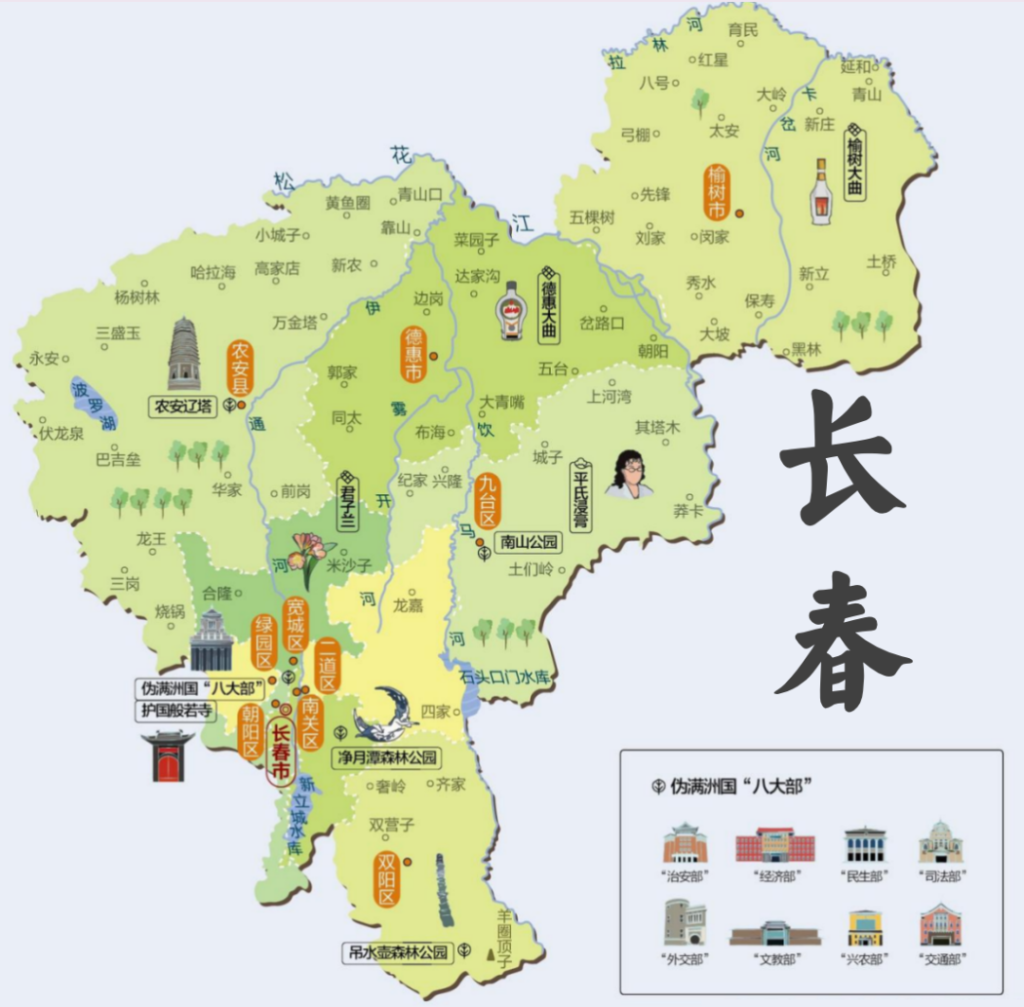 長春,別稱“北國春城”,古稱“喜都、茶啊沖”,吉林省省會,位於東北的地理中心,是著名的中國老工業基地和新中國最早的汽車工業基地和電影制作基地。