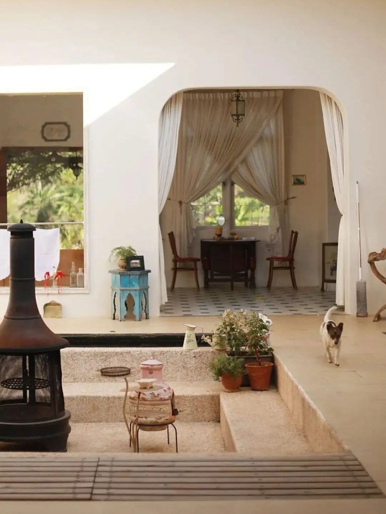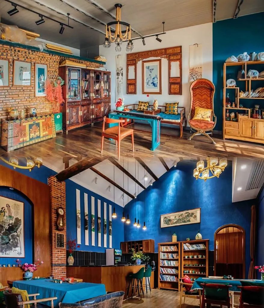民宿內一物一景,皆由主人親手設計打造:草木蔥蘢的庭院,映著瓦藍色窗台的暖光,再到每張手繪餐桌、每件茶器與花瓶,無不注入了主人的溫度與靈魂印記。