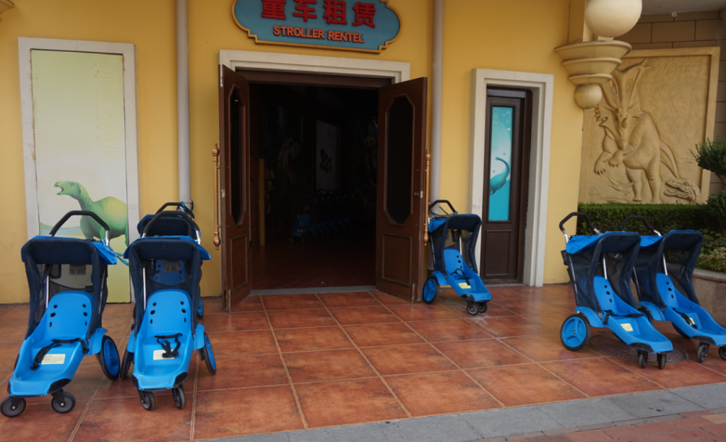 右前方是童車租賃,如果不想在玩了一會後孩子累、自己也累的不行的時候還要抱他,可以直接先租賃一部童車,80元使用4小時(需要押金),推行起來十分便捷。帶鎖的,玩項目時,可以把車鎖起來。