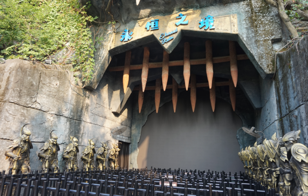 在金剛旁邊是一個室內項目“永恒之境”,一個行走類觀光的項目,觀看一些神秘場景以及多媒體、光影互動,主題是精靈守護家園,沒有身高限制。