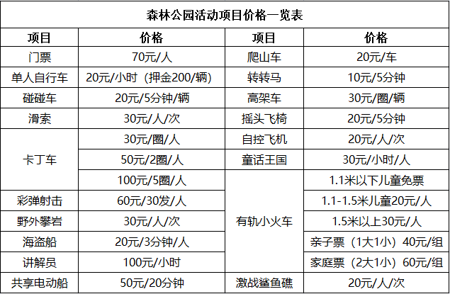 除了自然景觀以外,森林公園內還有許多娛樂項目,如:碰碰車、滑索、卡丁車、射擊、童話王國等(後附詳細清單價格)