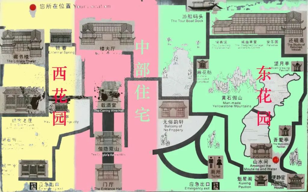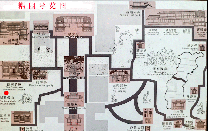遊玩路線為:入口➨轎廳➨載酒堂➨無俗韻軒➨“枕波雙隱”花窗➨東花園遊廊➨魁星閣➨便靜室➨山水間➨吾愛亭➨黃石假山➨城曲草堂➨儲香館➨藤花舫➨藏書樓➨織簾老屋➨鶴壽亭➨出口