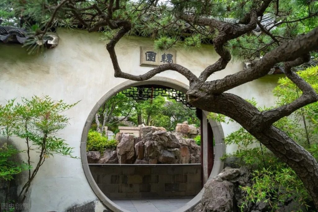 而從住宅區至東花園的“一松二竹”的入口設計更妙。不高的白粉牆上,辟有一個月洞門,西側為一叢南天竹,四季常綠,矮小可愛,宛若盆景;東側為一株小小的迎客松,掩映著洞門和門額,傾向著遊人,似欲為人們拂塵,松後牆隅,有修竹數竿,清風靜響。人未入園,身心已被洗淨。