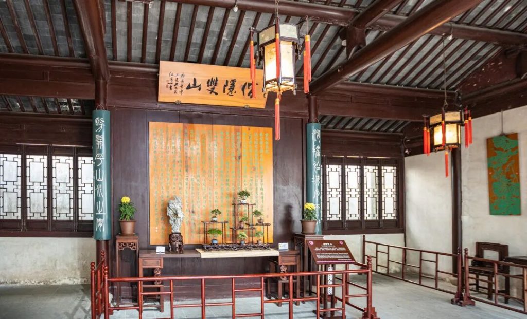 轎廳上懸“偕隱雙山”匾額,取之女主人嚴永華的詩句“偕隱雙山門,一塵差可托”,雙側柱上有:“逍遙於城市而外,仿佛乎山水之間”的對聯,表達了伉儷唱和、退隱山林之意。