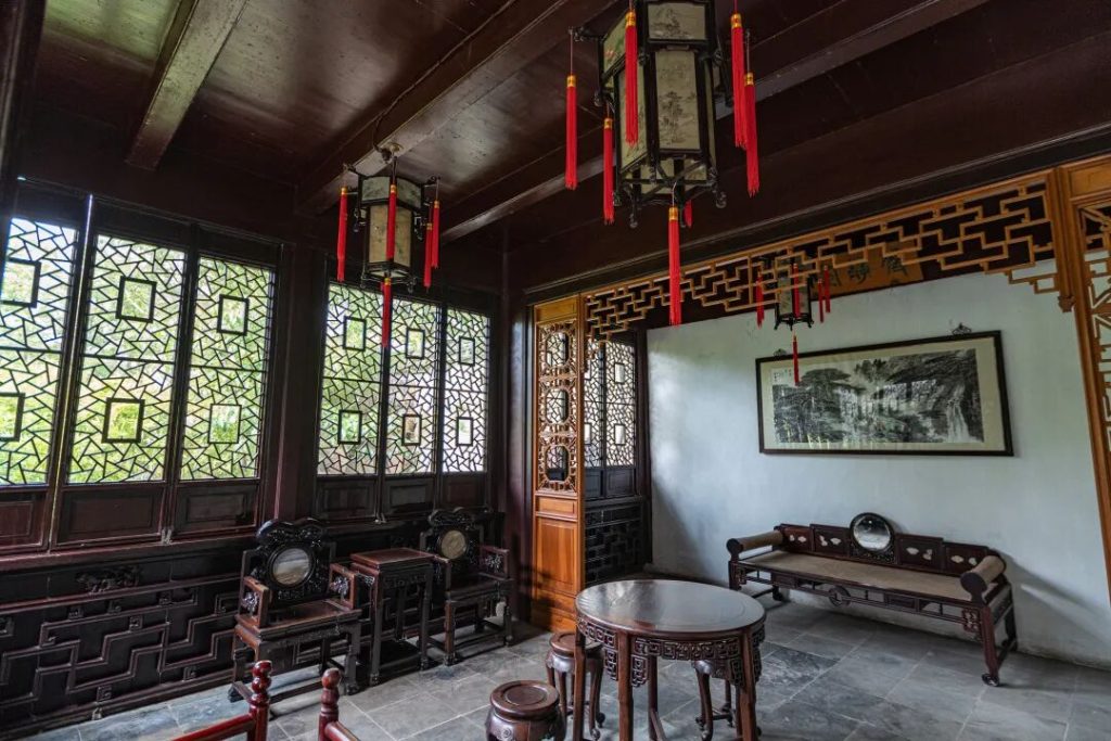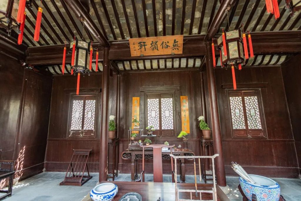 廳內陳設古樸雅致,宜在此靜定、小聚、雅淡。匾額上“無俗韻軒”是中國最後一批秀才蘇局仙所書,下方“園林到日酒初熟,庭戶開時月正圓”是清代何紹基所作。