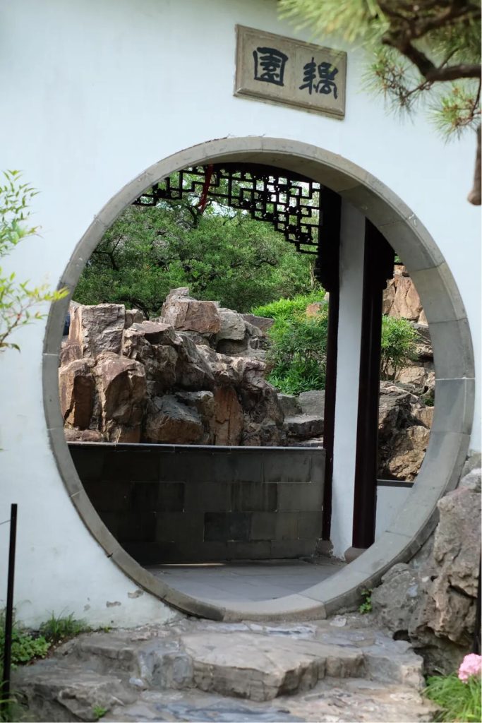 而從住宅區至東花園的“一松二竹”的入口設計更妙。不高的白粉牆上,辟有一個月洞門,西側為一叢南天竹,四季常綠,矮小可愛,宛若盆景;東側為一株小小的迎客松,掩映著洞門和門額,傾向著遊人,似欲為人們拂塵,松後牆隅,有修竹數竿,清風靜響。人未入園,身心已被洗淨。