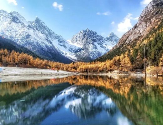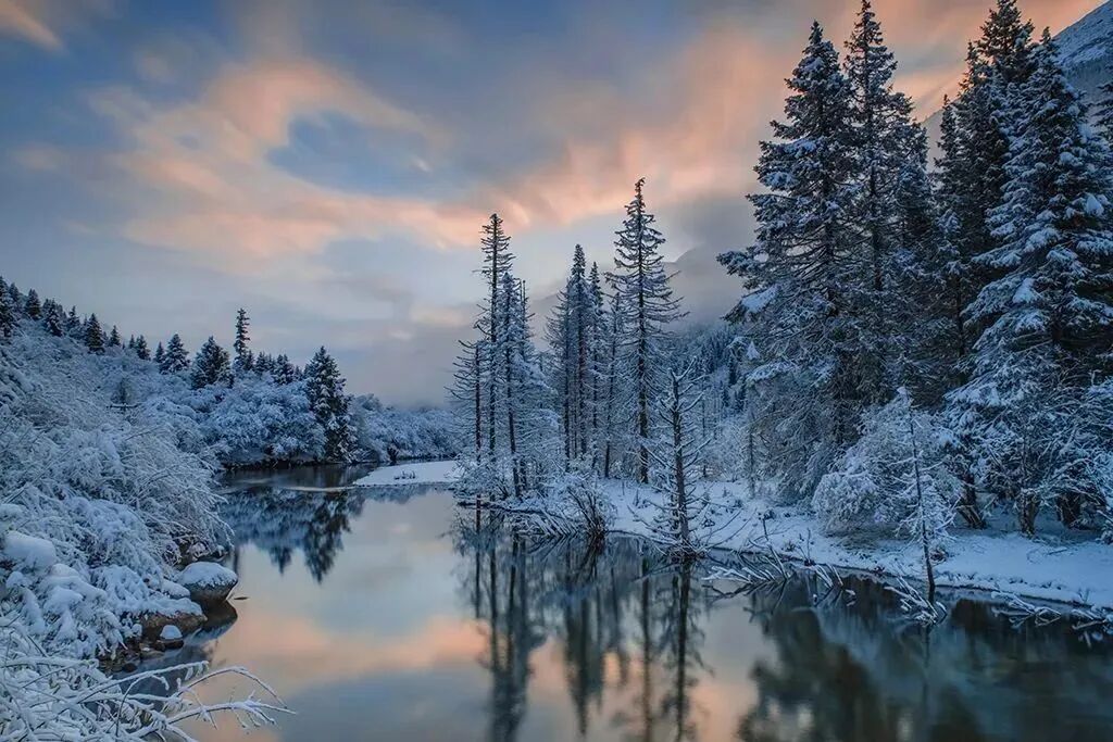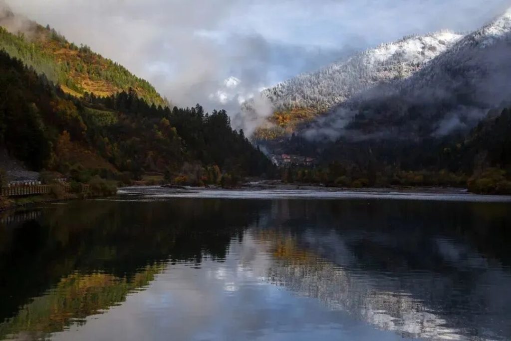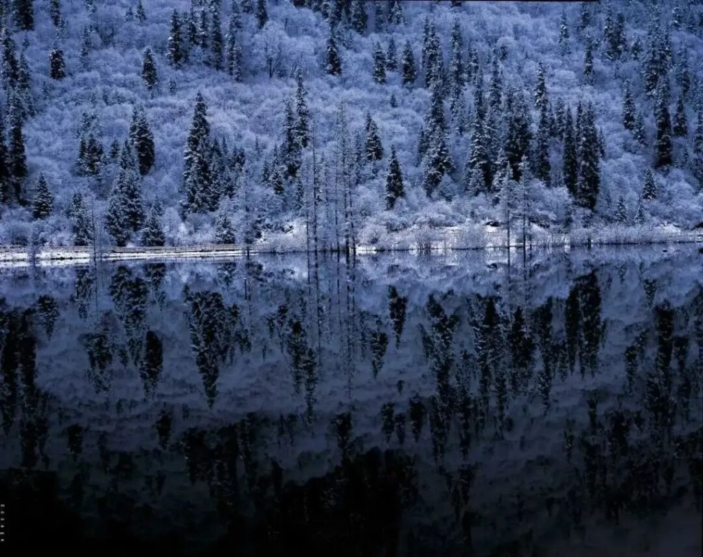 白雪冰枝,高山雪峰悉數倒映在達古湖中,簡直就是一個雅致寧靜的仙境之地。
