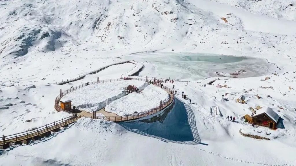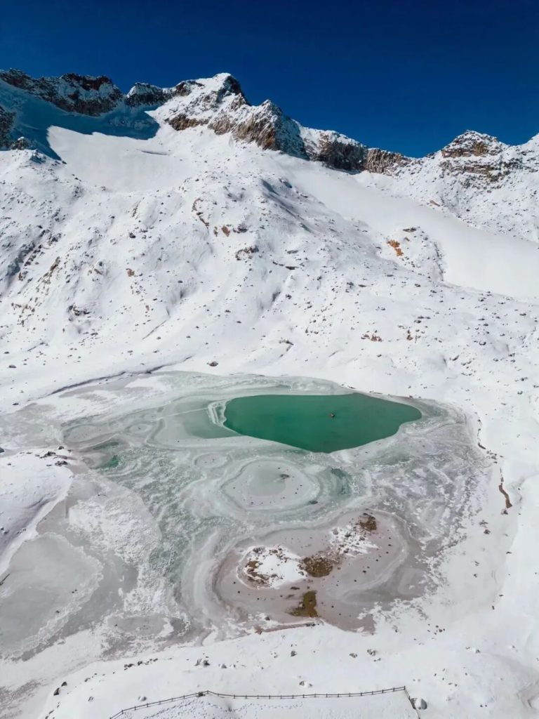 遠處一片碧綠的冰漬湖—山盟海誓淚湖在一片銀白色中脫穎而出,格外地吸引目光,由於溫度下降,一層冰面讓淚湖更添一份靜態美。帶著愛人到這裏許願打卡,對ta許下那份誓言。