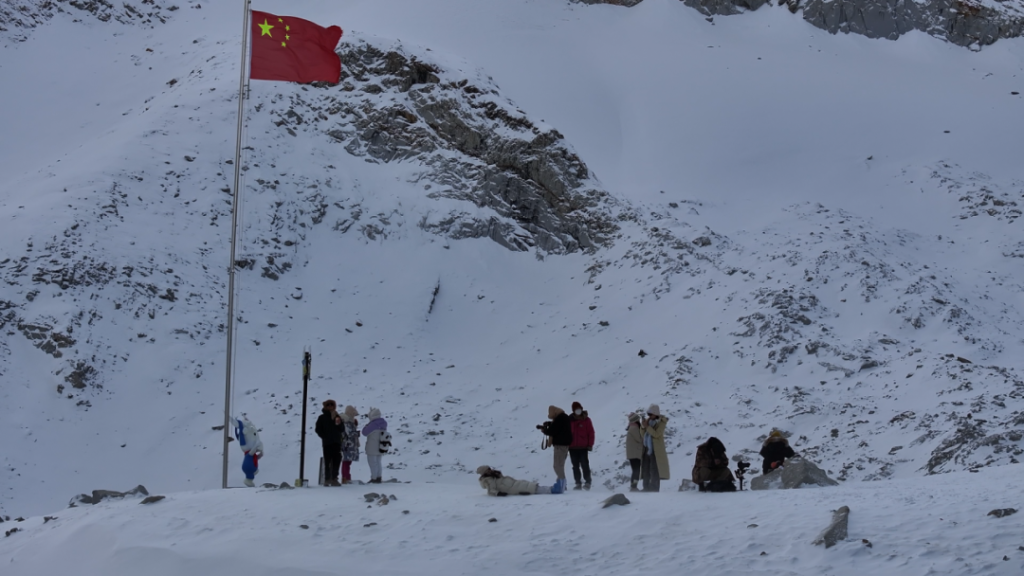 在另一邊的五星紅旗打卡點,是必去的景點之一。在排隊等待咖啡廳和下山索道時,就能看到鮮豔的五星紅旗在風中飄揚。在高山上,這一抹紅色非常醒目,與壯觀的雪山背景相映成趣。