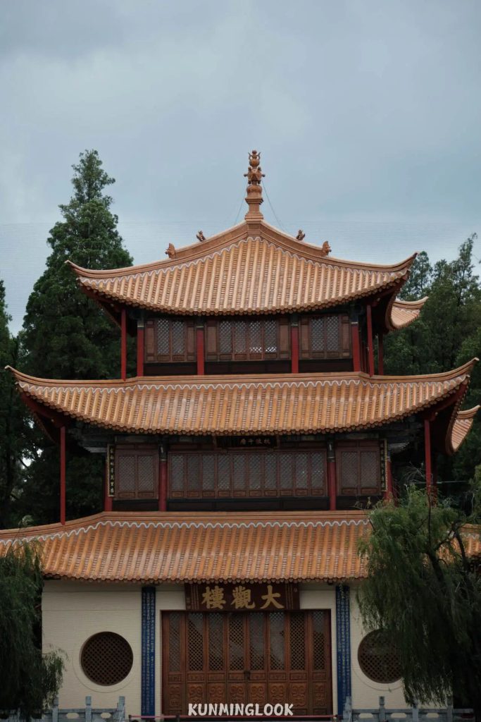 大觀樓位於昆明大觀公園近華浦內。始建於清康熙二十九年(1690年),現存建築系同治三年(1864年)改建,為木結構三重簷四攢尖頂式樓閣。樓高三層18米,面闊17米,進深10米,造型古樸典雅。登上大觀樓,近觀五百米滇池奔赴眼底,遠眺西山睡美人橫臥湖面,故被譽為“省城第一名勝”。