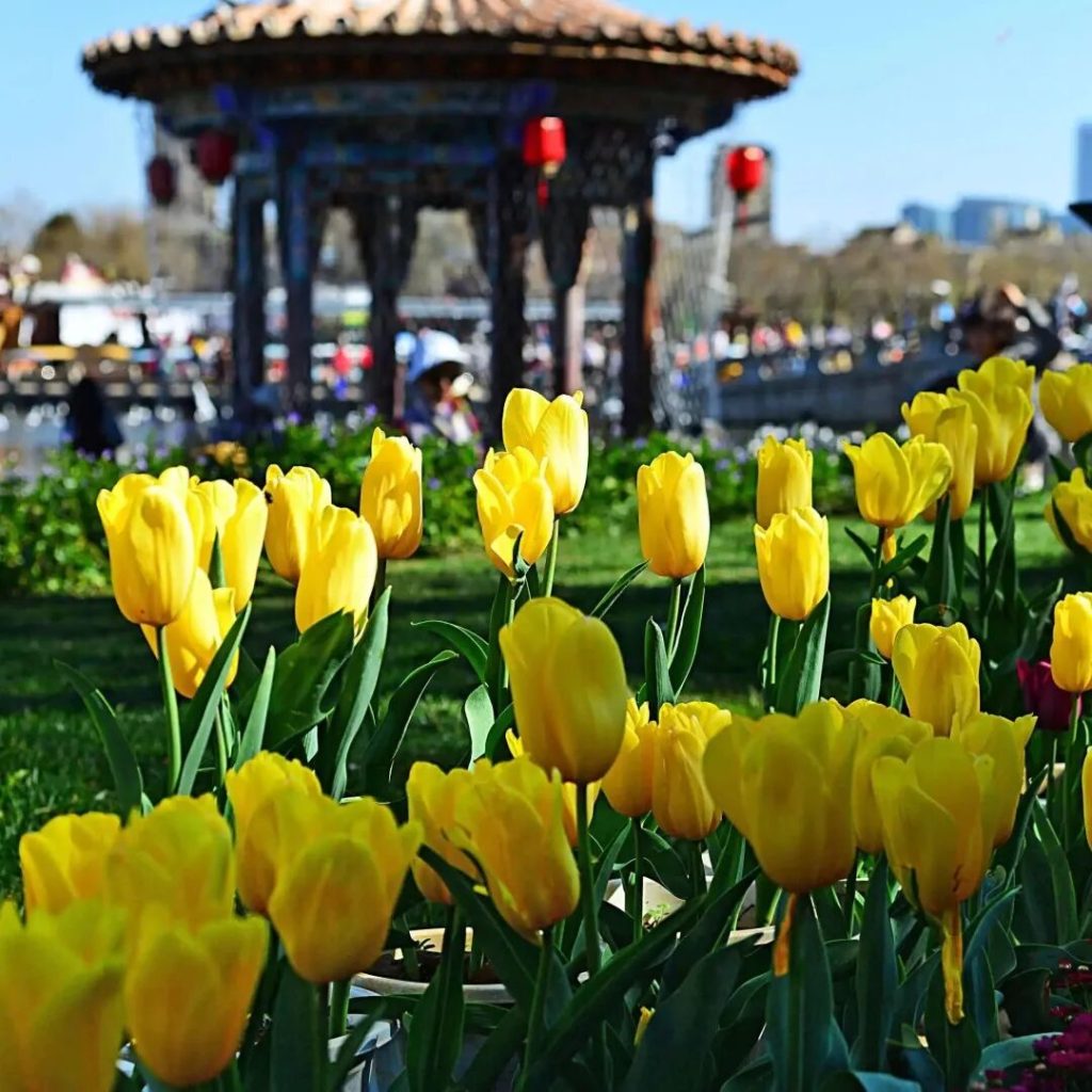 春日裏的大觀樓百花齊放,讓人應接不暇。2月初,鬱金香齊開放;3月初,海棠爭豔;4月初,月季初開,誰與爭輝(月季園)。