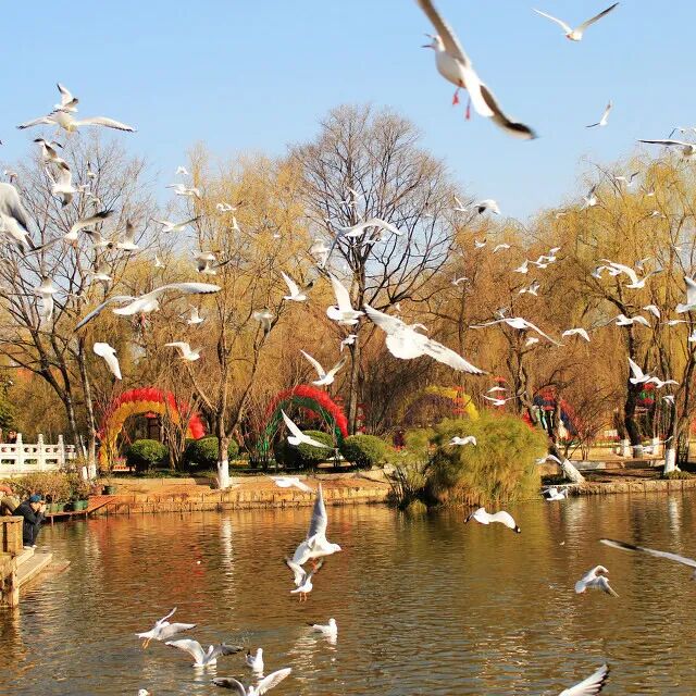 每年的冬天,昆明都會迎來一群小精靈——紅嘴鷗(海鷗)。海鷗在昆明的棲息地有很多,而大觀樓便是其中之一。因為有這群小家夥的加入,所以冬日裏的大觀樓依然生機勃勃。