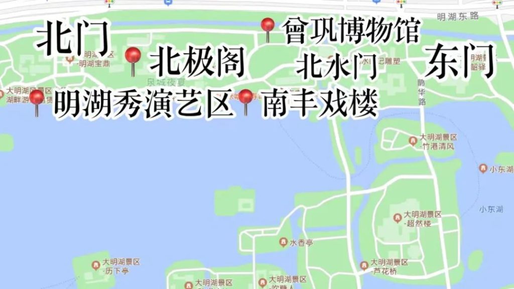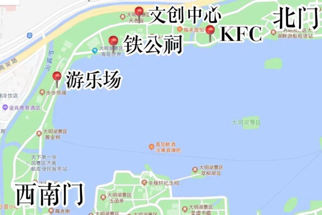 首先大明湖面積很大,先要弄清楚大明湖到底有幾個入口。大明湖主要有南門北門東門西南門,還有若幹小門,本篇會按照從哪個門進,有哪些相關景點的角度,來拆解大明湖的玩法。