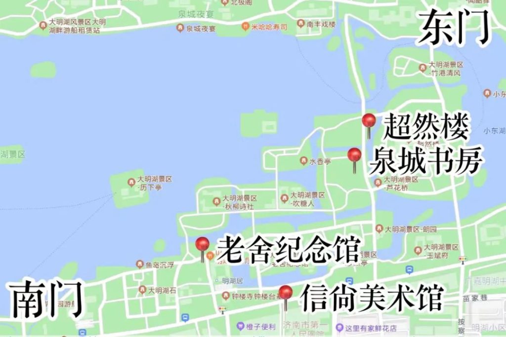 南岸沿線的有很多小出口,老舍紀念館往南,出去就是大明湖路,這一片都是商業,吃飯什么的都方便。信尚美術館就在這,就是大明湖路上那棟特別洋氣的白色小樓。