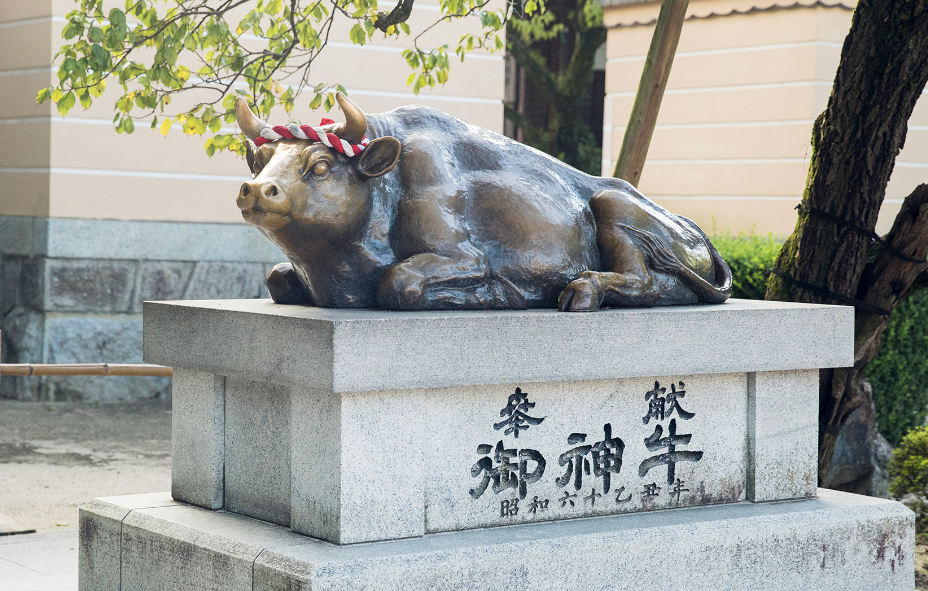 如今,神社周圍有11尊公牛雕像。最大的一尊由青銅鑄成,就位於通往神社庭園的入口標志——鳥居的前方。一些遊客會通過拍牛的頭部祈求變得更聰明,這也是牛頭部特別亮的原因。