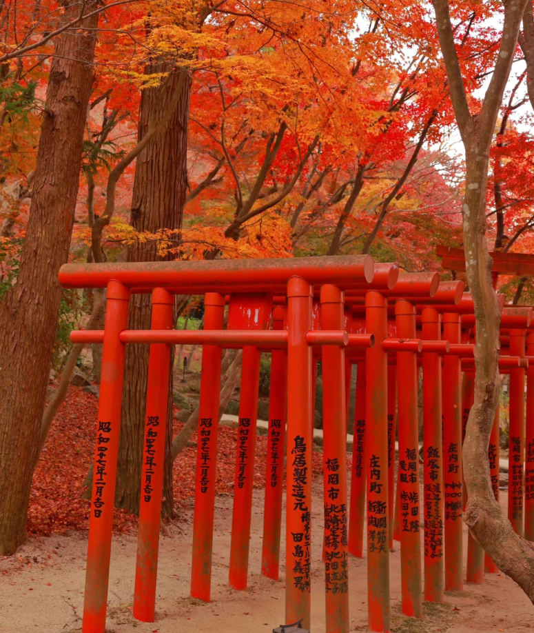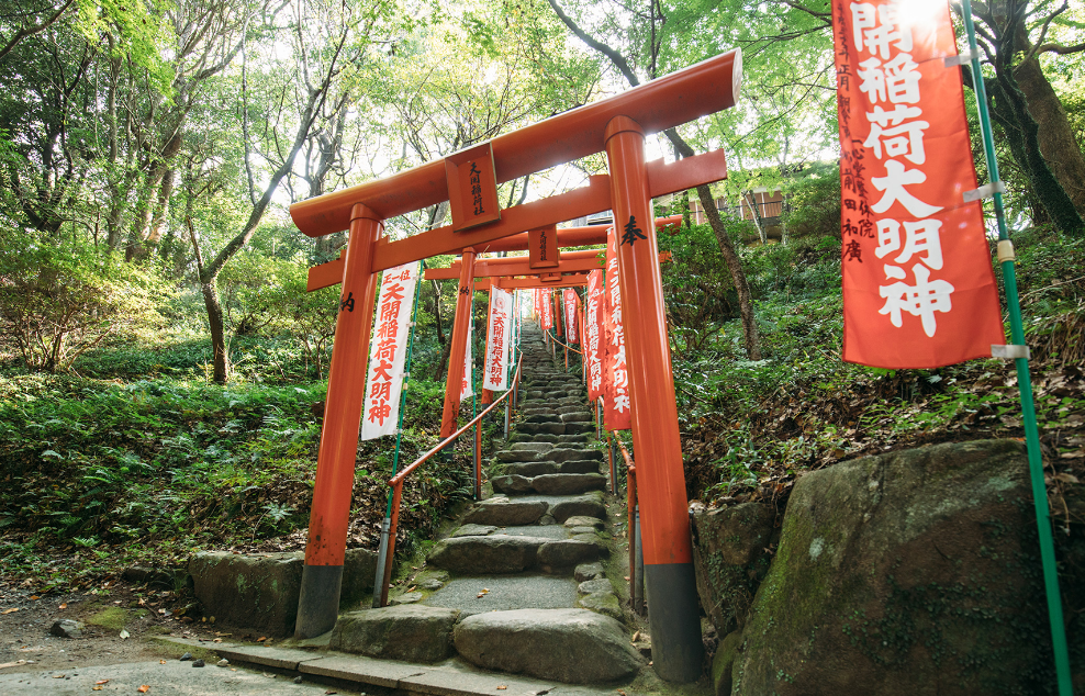 來到這個神社需要走過一條蜿蜒的小路,穿過草木叢生的庭園,沿著陡峭的石階一直向上。小路兩側掛著橫幅,鮮紅色的鳥居鱗次櫛比地排開。